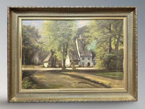 A Johansen : Building in woodland, oil on canvas, 65 cm x 44 cm.