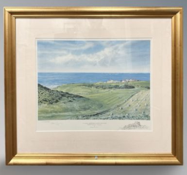 After Kenneth Reed F.R.S.A. (British, Contemporary) : 17'th Hole, Bamburgh Castle Golf Club, Northumberland, England, 2003, reproduction in colurs, numbered 1 from the limited edition of 350, signed in pencil by the artist, with printed remarque at bottom right depicting Bamburgh Castle, 40 cm x 52 cm, framed.