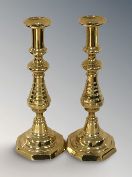 A pair of brass octagonal based candlesticks, height 30 cm.