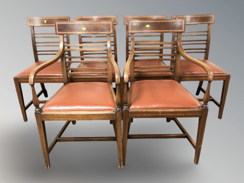 A set of six mahogany and satinwood inlaid dining chairs, two carvers and four singles