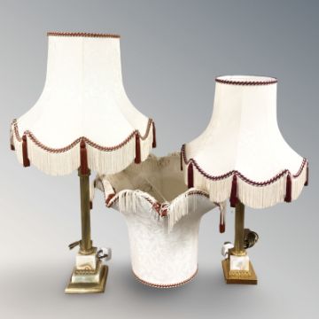 Two similar gilt brass and onyx columnar table lamps, with shades, plus two further spare shades, tallest 81 cm