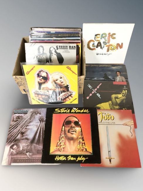 Vinyl LP records including Eric Clapton, Mike Oldfield, Stevie Wonder, Toto, Genesis, Eurhythmics, Simply Red, etc. (1 box)