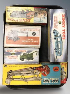A Dinky Toys 982 Pullmore car transporter, 925 Leyland dump truck, 571 Coles mobile crane, Dinky Supertoys 661 recovery tractor, Corgi 1011 Carrimore car transporter and a Dinky 130 Ford Console Corsair, all boxed.