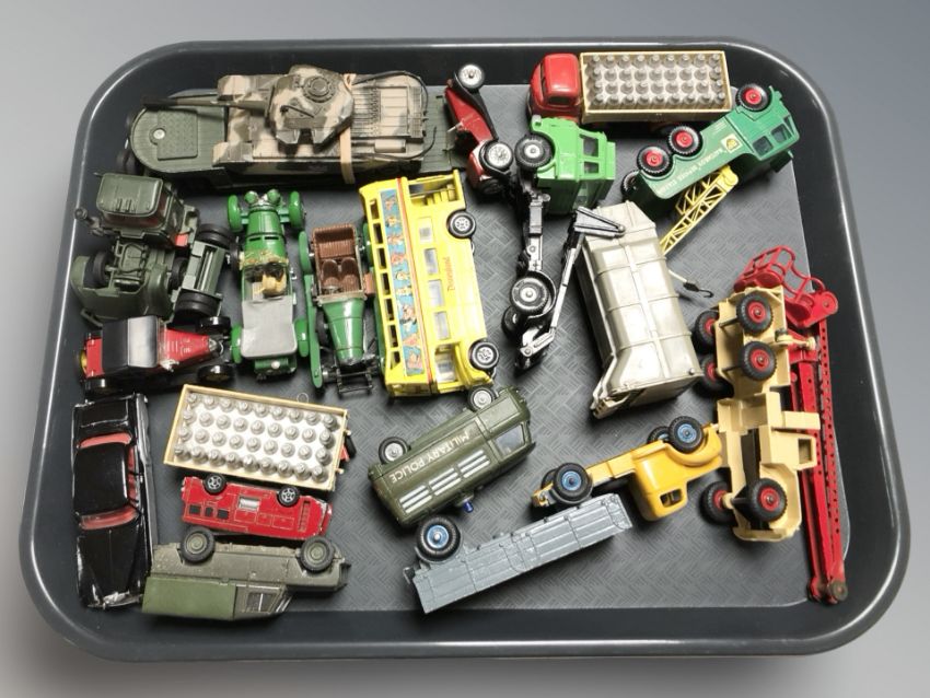 A group of unboxed Corgi and Matchbox die cast vehicles including military vehicles, classic cars, etc.