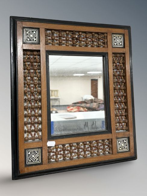 An early 20th century Islamic turned hardwood ebonised and mother of pearl inlaid wall mirror, 48 cm x 40 cm.