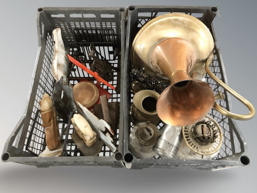 A quantity of metal wares, pair of onyx horse head bookends, painted metal doorstop, etc. (2 boxes)