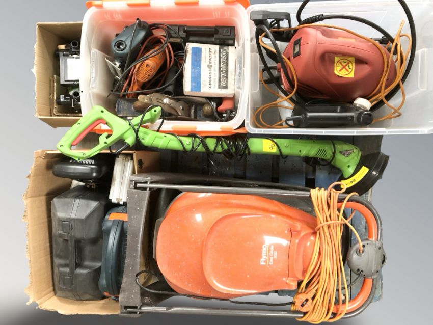 A pallet of various power and hand tools, Flymo lawn mower, electric strimmer, extension reel etc