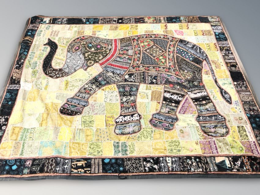 A large Indian embroidered throw with bead work decoration depicting an elephant, approximately 210 cm x 270 cm