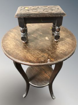 An oak circular two tier occasional table and a further carved oak stool