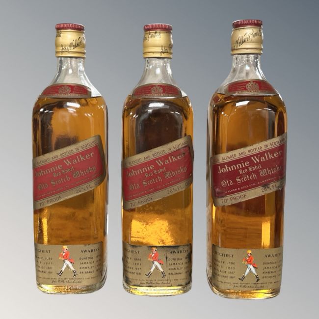 Three bottles of Johnnie Walker Red Label Old Scotch Whisky, 70% proof, each bottle 26 2/3 fl. oz. (3)