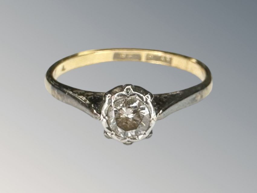 An 18ct yellow gold platinum set diamond solitaire ring, approximately 0.15ct, size J.