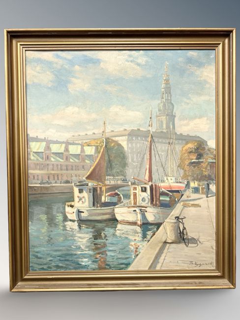 T Nygaard : Boats on a canal by Christiansborg Palace, oil on canvas, 63 cm x 74 cm.