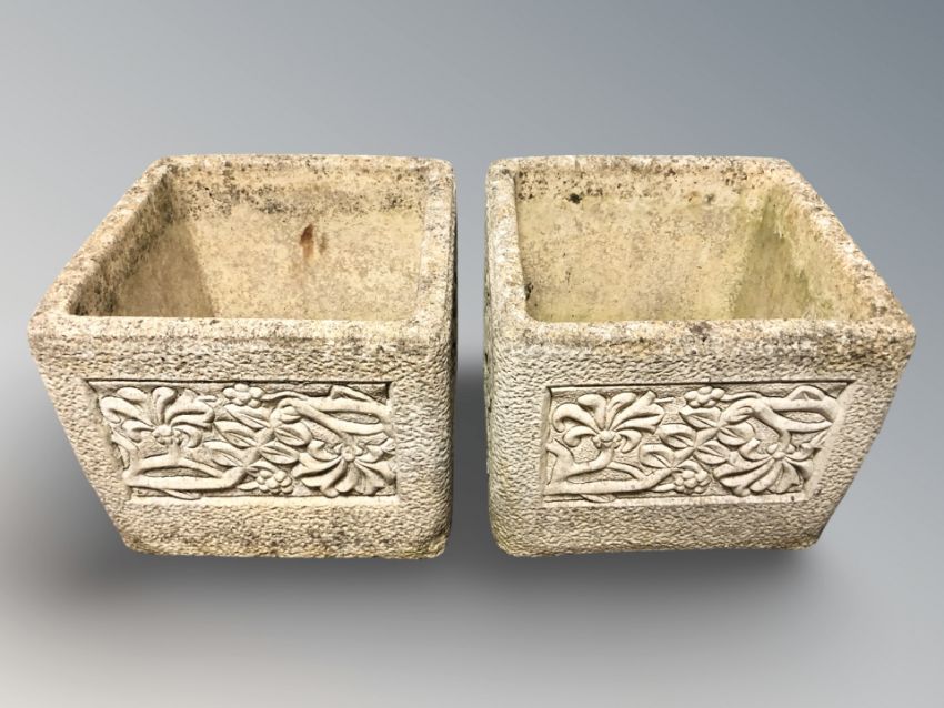 A pair of concrete square planters, width 33 cm