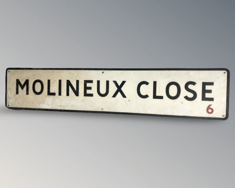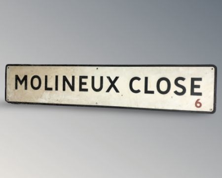 An enamelled metal Moulinaux Close street sign, 139 cm x 28 cm