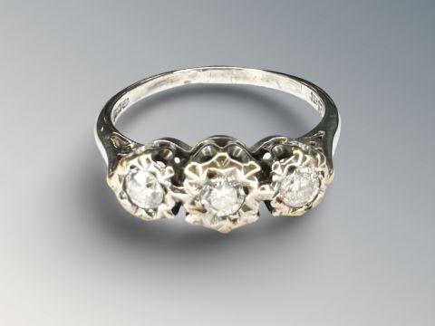 A 9ct white gold three-stone diamond ring, the stated diamond weight 0.25 carat, size L.
