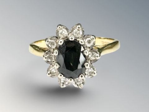 An 18ct yellow gold sapphire and diamond cluster ring.
