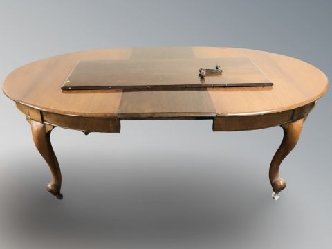 A set of six Queen Anne style walnut dining chairs, comprising two carvers and four singles, with needlework drop in seats, together with a walnut extending oval table with two leaves, on cabriole legs. Extended approx. 260 cm x 125 cm x 76 cm, with winder.