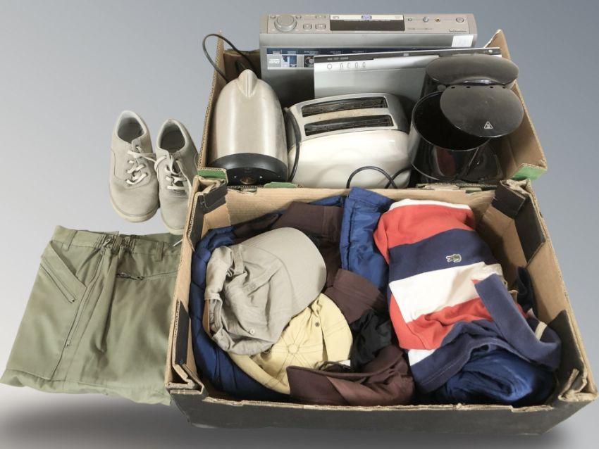 A quantity of home electricals, clothing, etc. (2 boxes)
