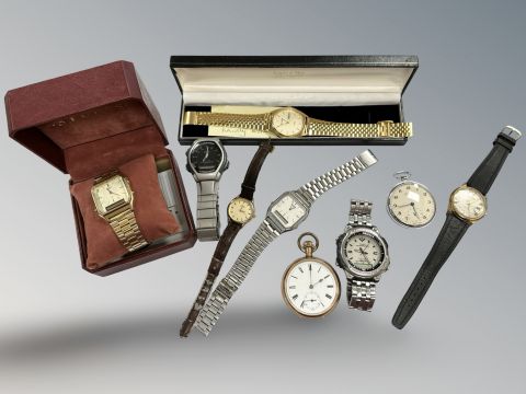 A gold-plated open face pocket watch, another signed Sekonda, a gent's vintage Rovena centre seconds calendar wristwatch, another gent's gold-plated Sekonda calendar wristwatch, two Casio watches, etc.