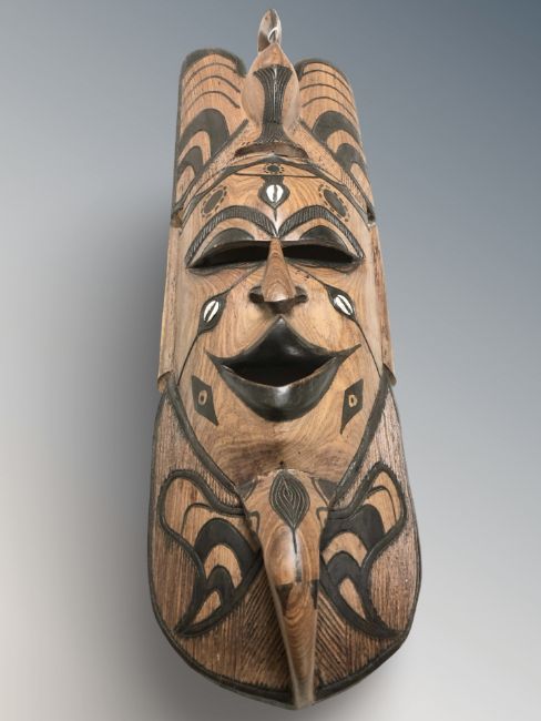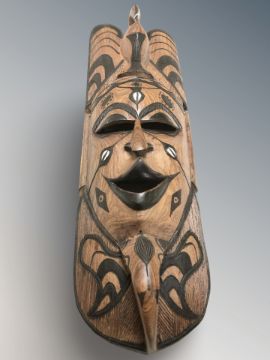 An Aborginial painted hardwood mask, length 100 cm, and a further pair of masks and a mirror.
