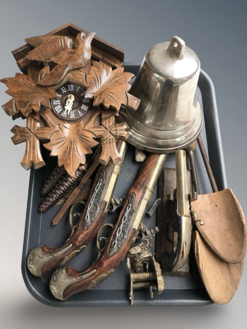 A reproduction carved beech cuckoo clock, replica flintlock and percussion cap pistols, a metal bell, etc.