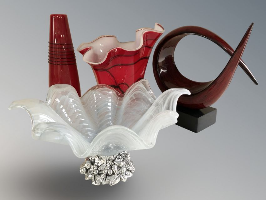 An Italian Murano glass centrepiece, bowl, width 39 cm, and three further pieces of art glass.