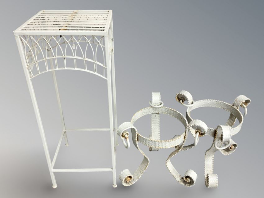 A mesh fire screen, a pair of wrought metal plant stands and a further plant stand.