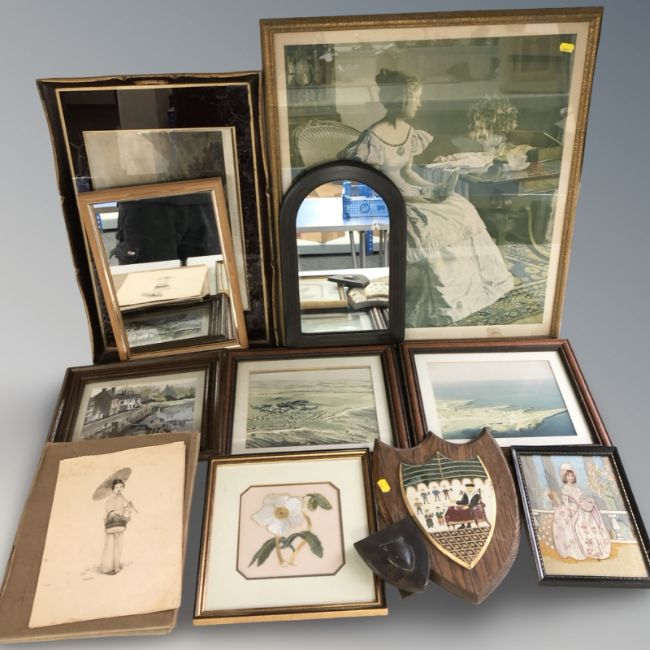 A quantity of pictures and prints, watercolours, small mirror, twin handled serving tray, etc.