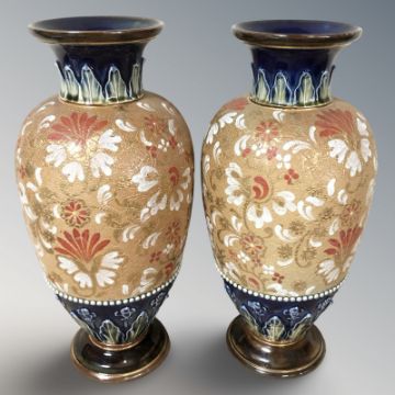 A pair of Royal Doulton Lambeth floral decorated vases, height 30 cm.