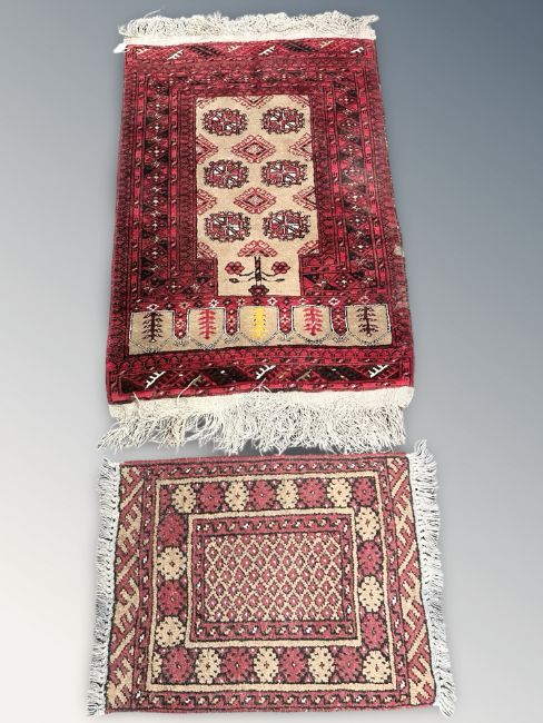 A Turkoman prayer rug, Afghanistan, 140 cm x 78 cm, plus a further Afghan rug. (2)