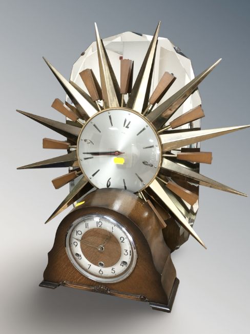 A Metamec sunburst quartz wall timepiece, an Art Deco frameless mirror and a mantel clock