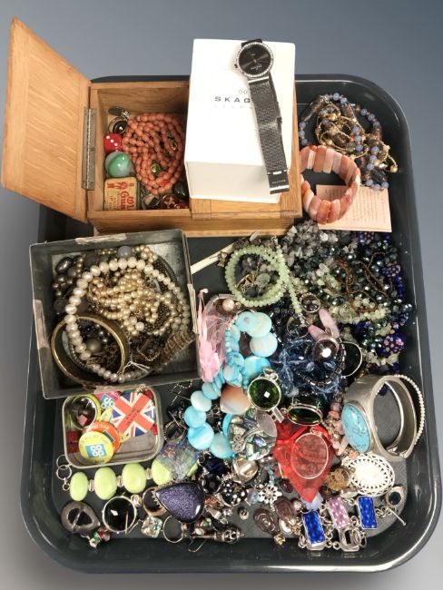 A collection of costume jewellery, bead necklaces, pendants, a Skagen wristwatch, cooperative badges, etc.