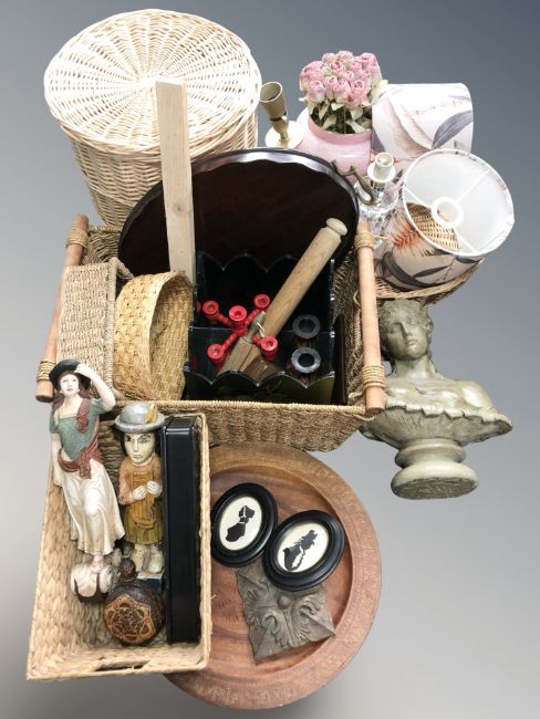 A group of wicker baskets, figures, lamp bases, pair of candlesticks, mahogany twin handled serving tray, etc.