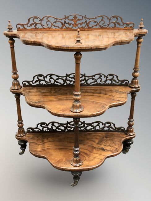 A Victorian figured walnut carved fret work three tier whatnot, 93 cm x 40 cm x 107 cm