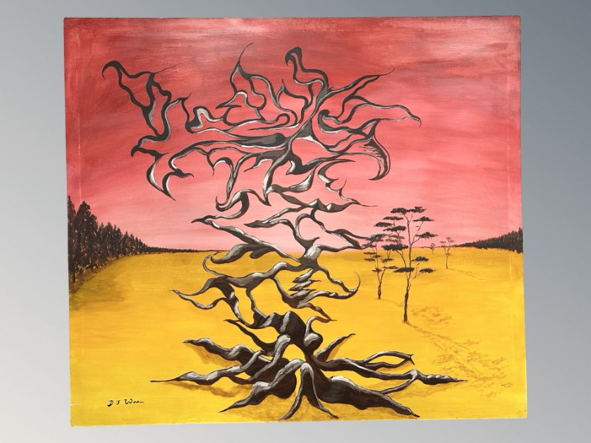 D J Wilson : Surrealist landscape, oil on canvas, 122 cm x 137 cm (unframed)