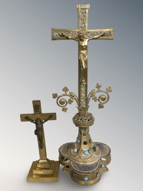 An ornate Victorian gilt brass enamelled and cabochon stone set crucifix, height 49 cm and a smaller brass crucifix