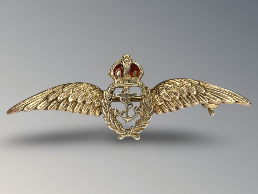 A 9ct gold and enamel Fleet Air Arm sweetheart brooch, width 43mm.