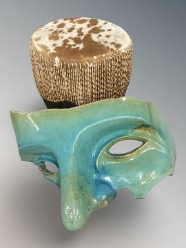 A hide covered drum and a large pottery mask fragment, width 50 cm.