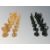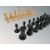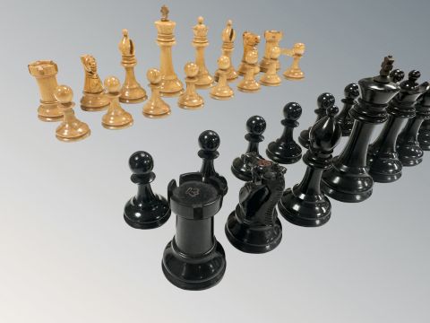 A Staunton boxwood and ebony chess set, late-19th century, kings 7.5cm/3", several pieces with red crown mark, none marked for Jaques, both Kings with replaced cross finials, one ebony Bishop is missing his finial, all pieces with green baize to underside, in later box.