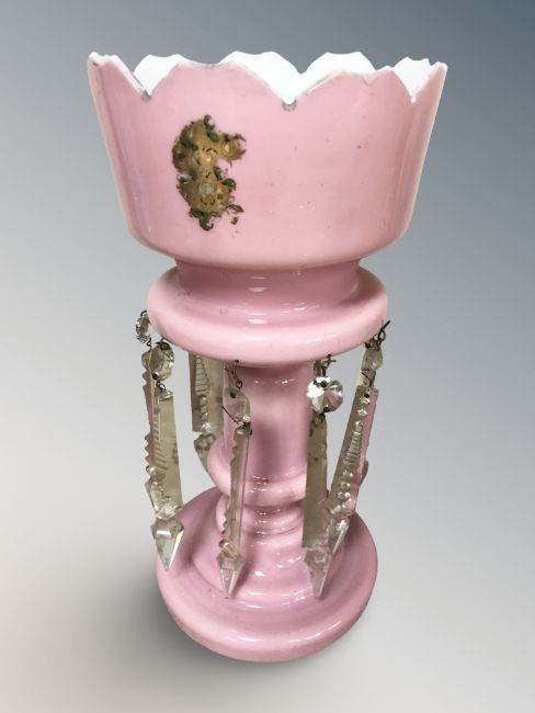 A Victorian pink glass table lustre, height 35 cm.