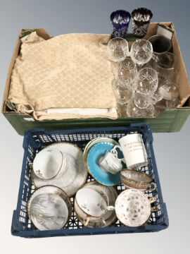 A group of crystal drinking glasses, Japanese export porcelain tea china, other tea wares, pair of curtains. (2 boxes)