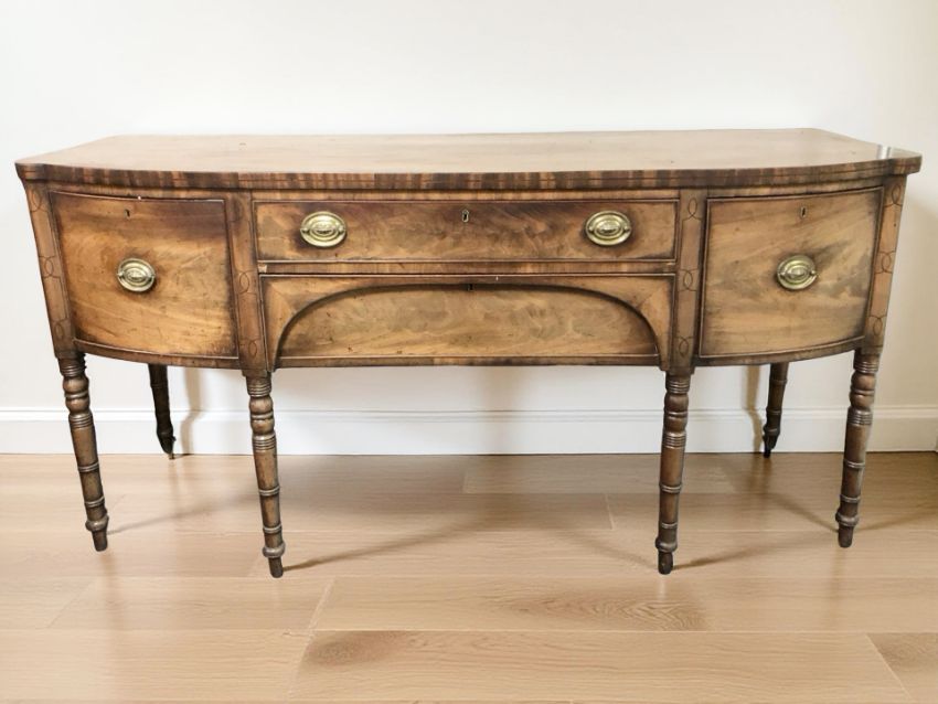 A Regency style mahogany bow front sideboard, 183 cm x 65 cm x 90 cm.