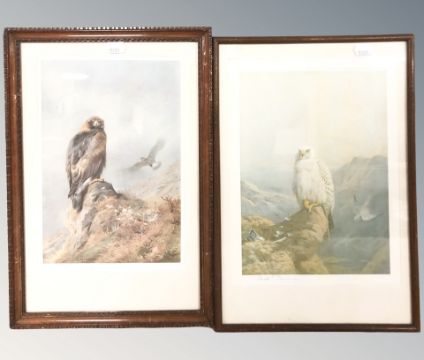 After Archibald Thorburn : Two colour prints depicting birds of prey, signed in pencil, 26 cm x 17.5 cm, together with a further print depicting owls perched on a branch, and a further limited edition monochrome print indistinctly signed. (4)