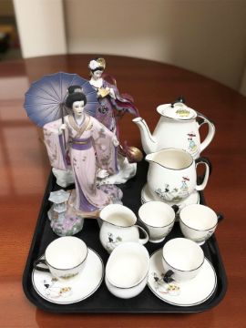 Fourteen pieces of Royal Winton tea china, and two Franklin Mint porcelain figures.