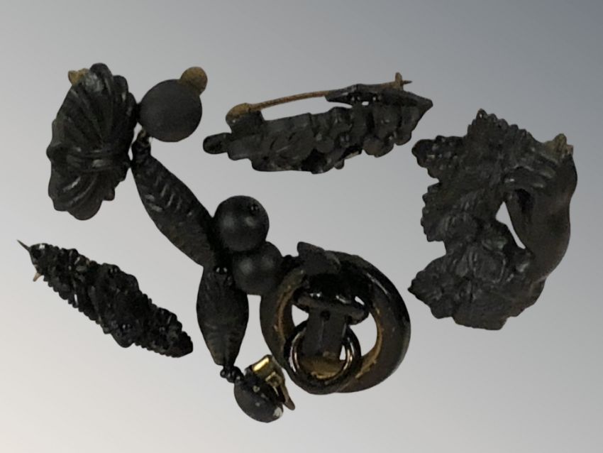 A group of Whitby jet brooches and earrings.
