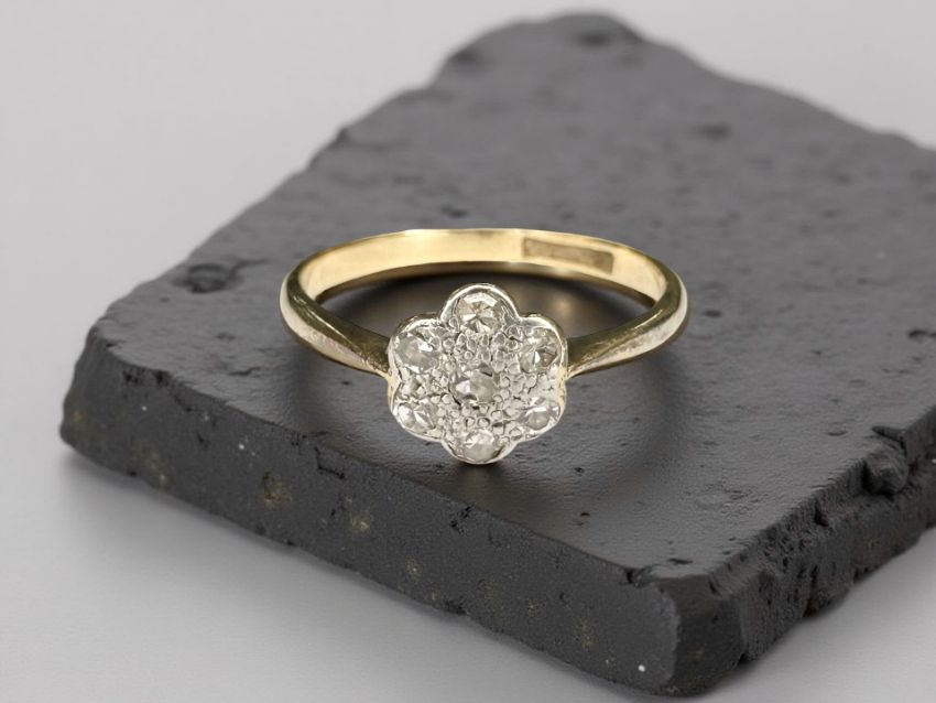 An 18ct yellow gold diamond daisy cluster ring, size M.