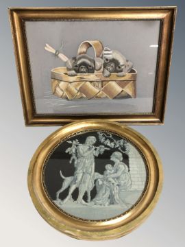 A needlework picture depicting puppies in a basket, a further continental embroidery and an oil on board study of two strung pigeons.