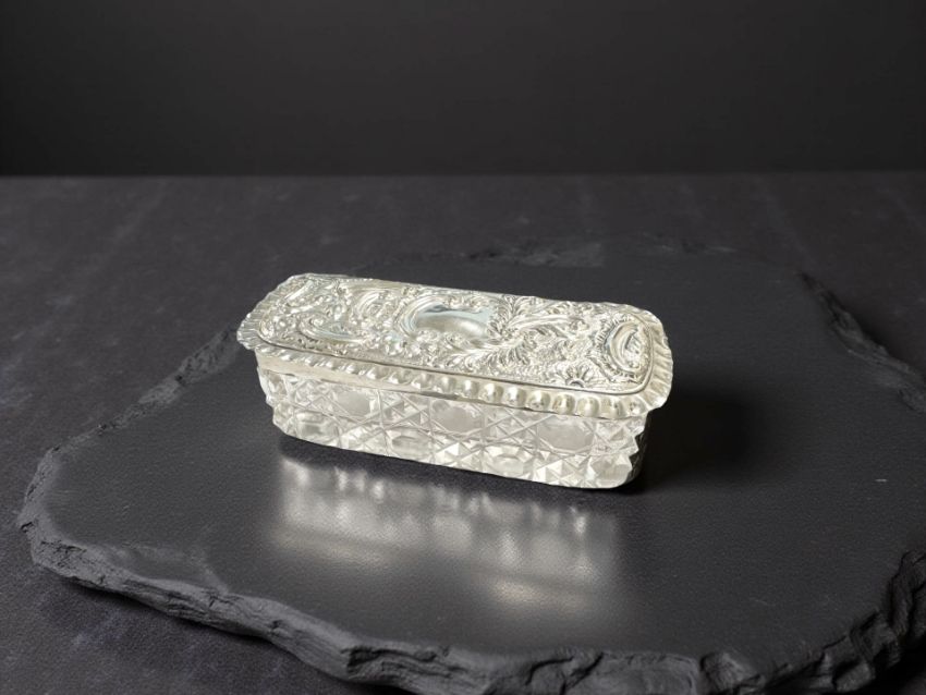 A cut crystal dressing table jar with silver embossed lid, Chester 1908, 9.5 cm x 4.5 cm.