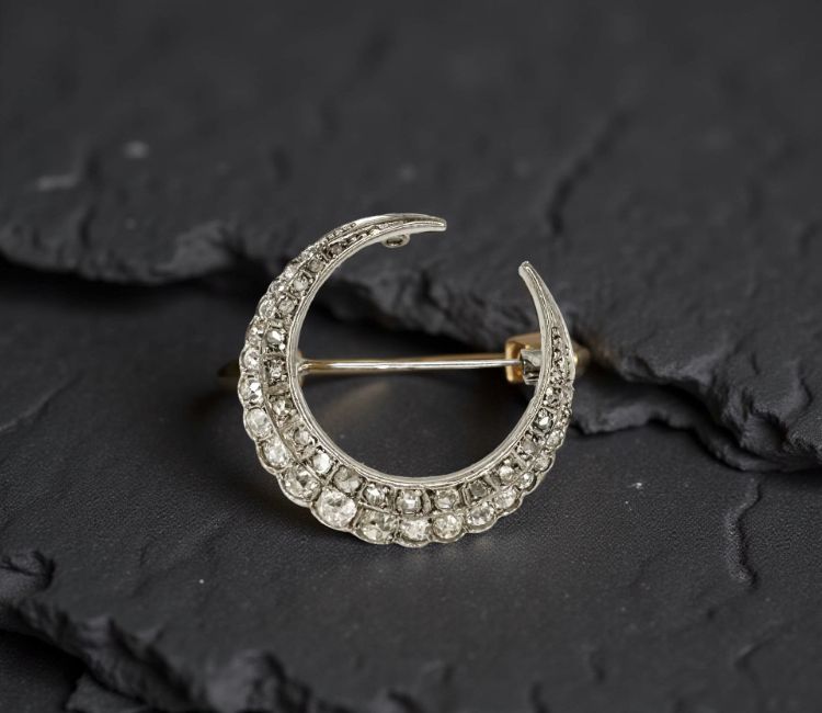 The brooch is un-marked, presumed 18ct white gold.. Most stones are fairly even in colour with a few drawing a little yellow, the largest stone approximately 3.5mm - 4 mm diameter.