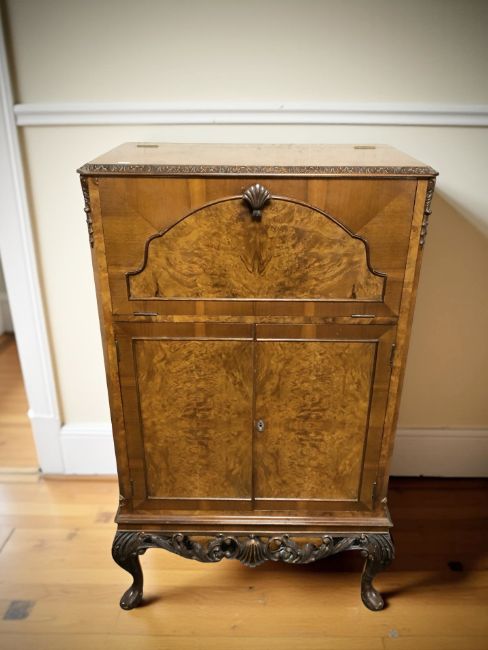 A 20th century Gold Feather Products burr walnut drinks cabinet, 75 cm x 40 cm x 127 cm.